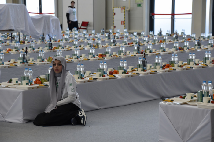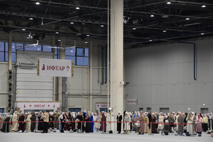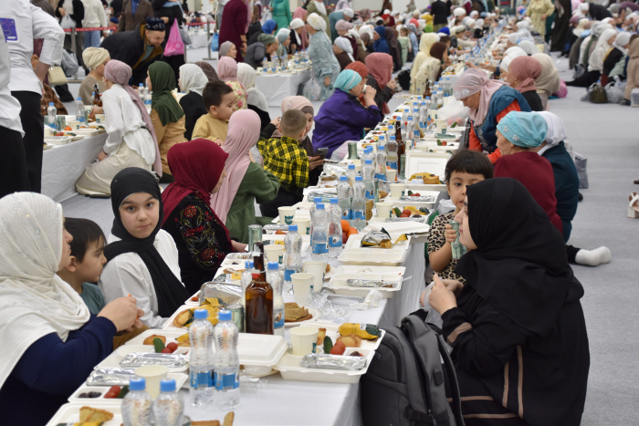 Далее мужчины и женщины разместились в помещениях павильона №3, где было накрыто около 1700 столов с угощением. На ифтар гостей ждала гречка с мясом, овощи, фрукты, выпечка, а также халяльная кола.